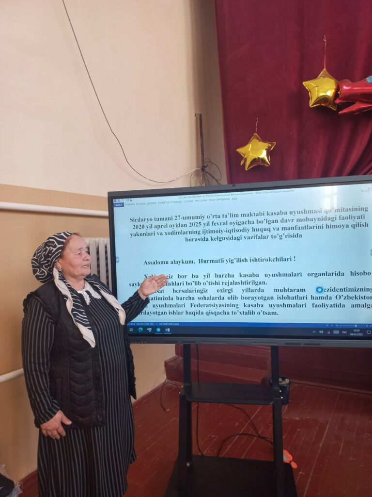 Sirdaryo tumanidagi 27-umumiy o‘rta ta’lim maktabida kasaba uyushma tashkilotining hisobot-saylov yig‘ilishi bo‘lib o‘tdi