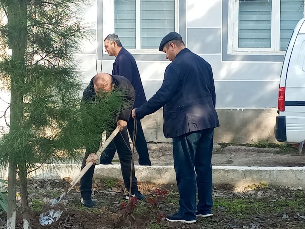 Ҳашар доирасида фақатгина кўчат экиш билан чекланилмай, бино атрофларини тозалаш, дарахтларга шакл бериш ва оқлаш, ариқларни тозалаш каби кенг кўламли ободонлаштириш ишлари ҳам амалга оширилмоқда.